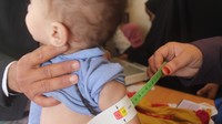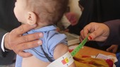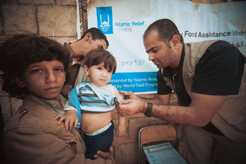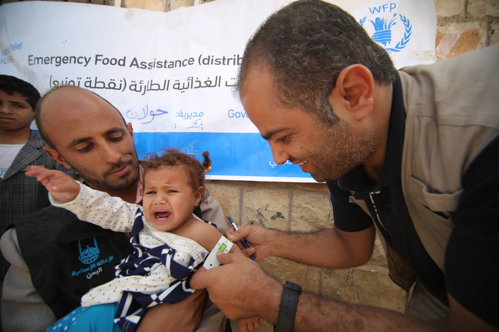 Auf dem Foto misst ein Helfer den Oberarm eines kleinen Kindes, um den Grad der Unterernährung festzustellen...
